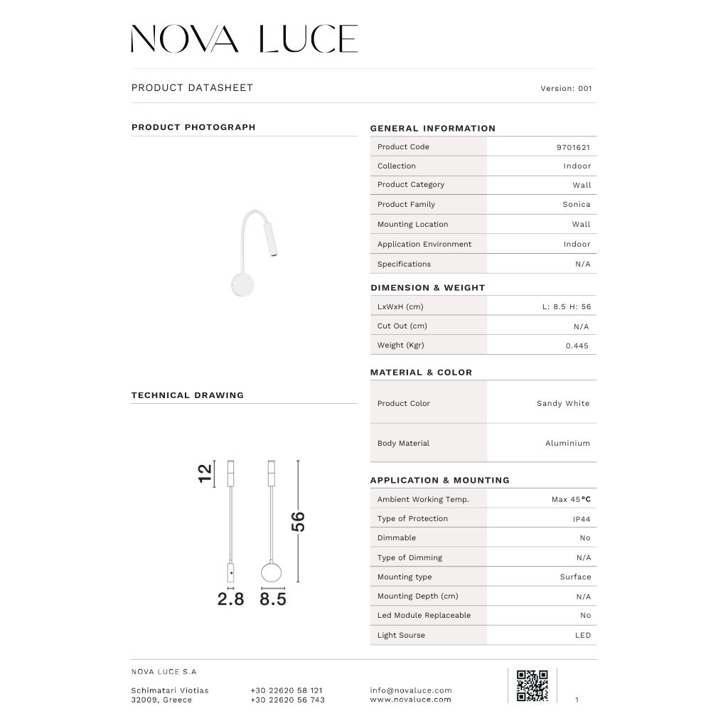 SONICA veggljós LED 5W 453lm 3K IP44 hvítt